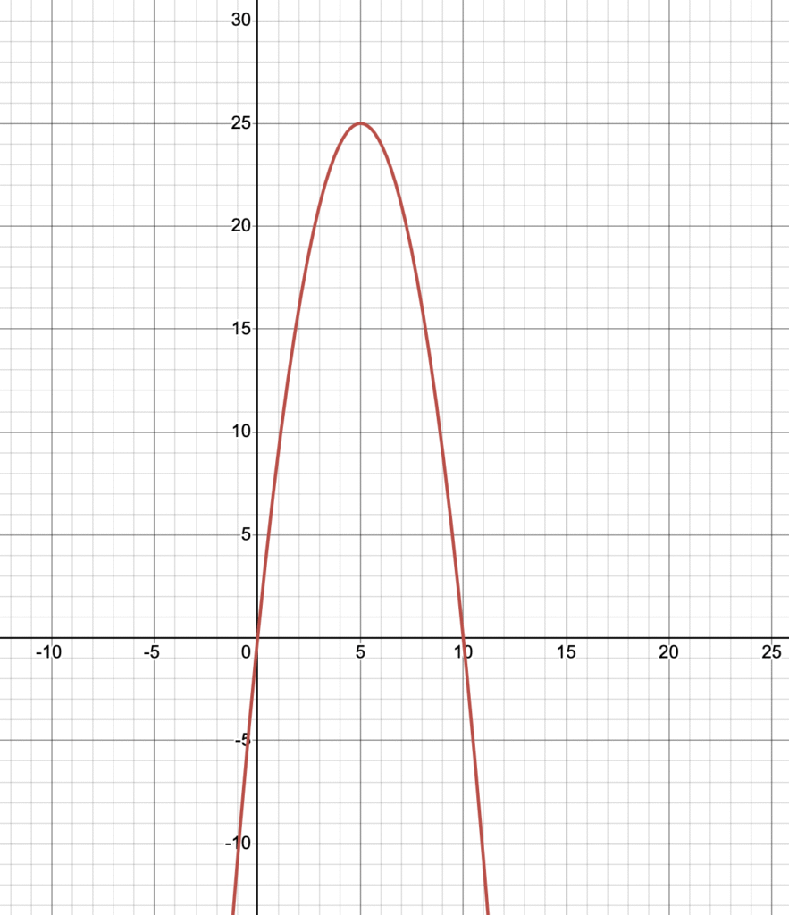 例えば、こんなグラフがあったとしたら最も高い点である(5,25)がこのグラフの頂点であることがわかります。