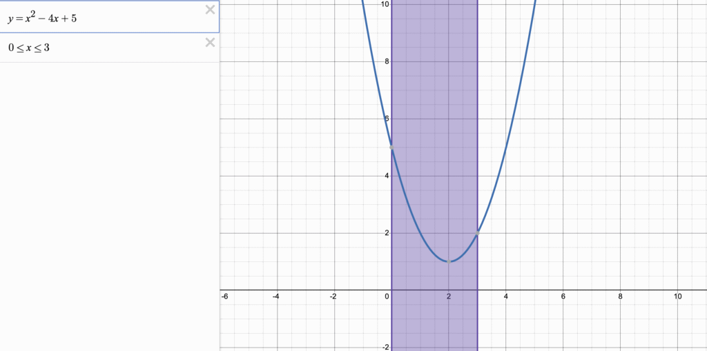 つまり、頂点が(2,1)であることがわかります。その次に定義域を見ます。そうすると、頂点の座標が定義域の中にありますね。なので、最小値はx=2の時、y=1であることがわかります。