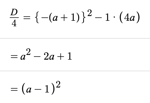 D>0になるのが条件でした。なので、a=1になってしまうと、( )の中が0になってしまうので、a=1にはならない…①ということが判別式からわかります。