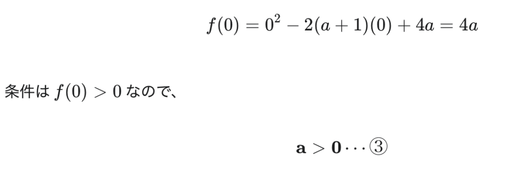 そして端点です。x軸よりも上にあるので0以上ですね。なので、f(0)を代入します。